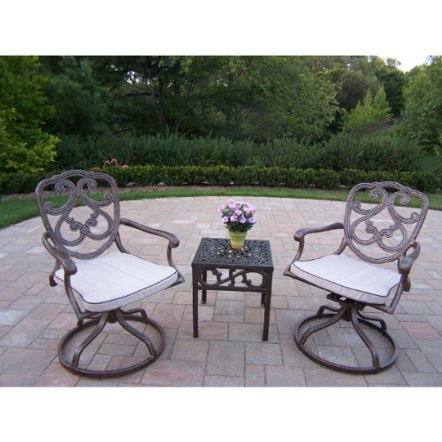FeaturesColor: Antique BronzeSet includes End Table and 2 Swivel Rockers w CushionsMade of Rust Free Cast Aluminum ConstructionEasy to follow assembly instructions and product care informationStainless steel or brass assembly hardware Oakland Living 2204-2106-5-AB Pacifica Swivel Rocker Outdoor?
