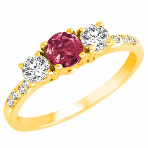 18K Yellow Gold Round 3 Stone Diamond and Pink Tourmaline Ring With Pave Set Shank (0.95 ctw) Size
