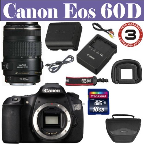 Features18.0-megapixel CMOS sensor and DIGIC 4 Imaging Processor; ISO 100-6400 (expandable to 12800)Includes EF 70-300mm f/4-5.6 IS USM LensImproved EOS HD Video mode with manual exposure control; Vari-angle 3.0-inch Clear View LCD monitor5.3 fps continuous shooting; enhanced iFCL 63-zone, Dual-layer metering systemCompatibility with SD/SDHC/SDXC memory cards Canon EOS 60D 18 MP CMOS Digital SLR Camera with 3.0-Inch LCD and EF 70-300mm f/4-5.6 IS USM Lens + 16 GIG Memory Card - Holster Case - 3 Year Warranty by 33 Street Camera?