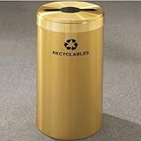 | ✚✚✚ Glaro RecyclePro Value Series Receptacle, 41 Gallon, 20 inch W, 2 in x12 in slot w/ a 5.5' dia. center hole, Recyclables message w/ Recycling Logo, Satin Brass Finish, Satin Brass Top Glaro RecyclePro Value Series with Multi-Purpose Opening for Mixed Recyclables help save the environment while keeping high traffic areas free of litter. The receptacle has a 2 inch x 12 inch slot with a 5.5' dia. center hole and includes a removable fireproof galvanized steel inner liner as well as a non-corrosive aluminum bottom that protects the floor. The cans are available in 2 all metal finishes; All Satin Aluminum and All Satin Brass; or 5 designer powder coat finishes; Satin Black, Burgundy, Desert Stone, Hunter Green and Espresso Brown - with your choice of a Satin Aluminum, Satin Brass or Matching Powder Coat finish cover.