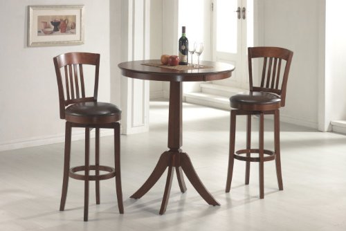 Hillsdale Plainview Canton 3 Piece Bar Set 4166833PTS?Hillsdale Plainview Canton 3 Piece Bar Set - HIL-4166833PTS The Archer bistro set, in a brown finish, features 360 degree swivel barstools with dark brown faux leather seats, a transitional arched back design and simple, tapered and slightly flared legs. The bar height table compliments the barstools with a slender pedestal base, flared legs, and a round top with a generous apron. Composed of hardwoods and climate controlled wood composites, minor assembly required. What's included: Bar Table (1) 30" Archer Barstool (2) Features: Belongs to Planview Collection Classic to Transitional style Finished in Brown Pedestal Table Type Recommended care: Dust frequently using a clean, specifically treated dusting cloth that will attract and hold dust particles. Do not use wax or abrasive cleaners as they may damage the finish. Dimensions: Table: W36" x D36" x H41" Barstool: W18" x D18" x H46" Details: Product Type: Bar Set Product Finish: Brown Style: Classic, Transitional Product Material: Wood Shape: Round Table Type: Pedestal Table Table Length: 36" Product Collection: Planview Brand: Hillsdale Weight: 93.20 lbs