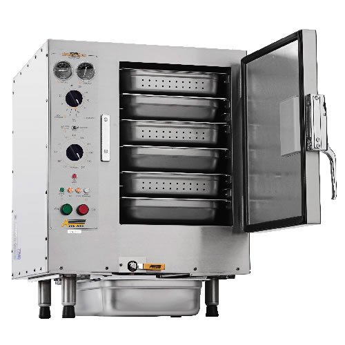 Accutemp S62083D0803020 6-Pan Stand Mounted Steam'N'Hold Steamer - S6 Series . NOTE: Steamer does not include support stand or legsSimple to use and install, the 6-Pan Stand Mounted Steam'N'Hold Steamer - S6 Series (S62083D0803020) from AccuTemp is incredibly easy to maintain and will dramatically reduce cook times compared to a traditional boiler-powered steamer. Able to hold six standard-size hotel pans, this innovative Steam’N’Hold steamer can do much more than just cook food. In fact, it features three operating modes: Fast Cook, low-temperature steam mode and the NSF-certified hold mode. Best of all, it uses AccuTemp’s Super Duty heater configuration to generate steam quickly instead of using a boiler. This unique heater configuration also doesn’t build up lime and scale like a boiler, so it is much easier to clean and maintain. Features: External thermostat, Energy Star® certified, Super Duty heater configuration, Durable, stainless steel construction, Heating elements produce 8 kW of energy, Steamer comes with Lifetime Service and Support guarantee. Benefits: Full 3 gallon capacity reservoir provides hours of steaming capability without refilling, Boilerless design dramatically reduces lime build-up and significantly reduces required maintenance, Patented vacuum technology removes insulating air from cooking chamber, allowing steam to more efficiently release its heat energy, Convenient connectionless design means that it doesn't require any water or drain lines and allows it to be installed virtually anywhere. Additional Considerations: Support stand or legs not included, Additional voltages and phases available. Contact product expert for more information.