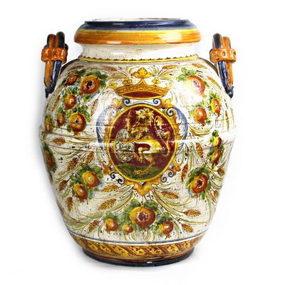 MAJOLICA LEONE ROSSO: Orcio Double Handles [#4565-SGM] The central motif of our all new Majolica Leone features the renown 'Leone di Montelupo' (The Montelupos Lion) that, surrounded by its heraldic stemma, has been the 'emblema' of the 'Montelupo Fiorentino' area where the original Tuscan Majolica are manufactured since he XV Century. Montelupo Fiorentino is located just on the outskirts of Florence and the world known Chianti region. This beautifully executed product was created using the Ingobbio technique, the ancient Tuscan process that gives such an authentic Old World look, while adding much greater body to the colors. You can actually feel the consistent (almost raised) body of the painting when gently passing your hand over the decorated parts. Due to the complexity of both preparation and painting, this technique is now used by very few artisans, which makes these items very hard to find. Hand-made by master artisans from Tuscany.